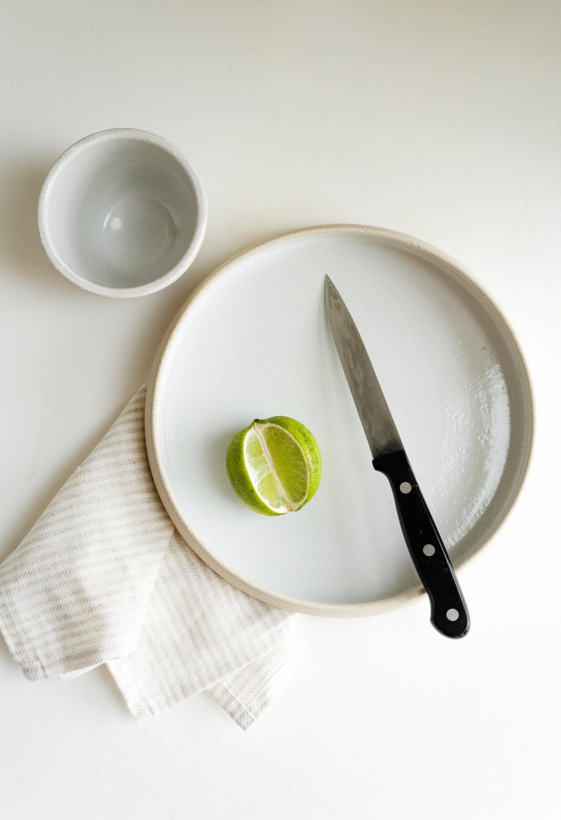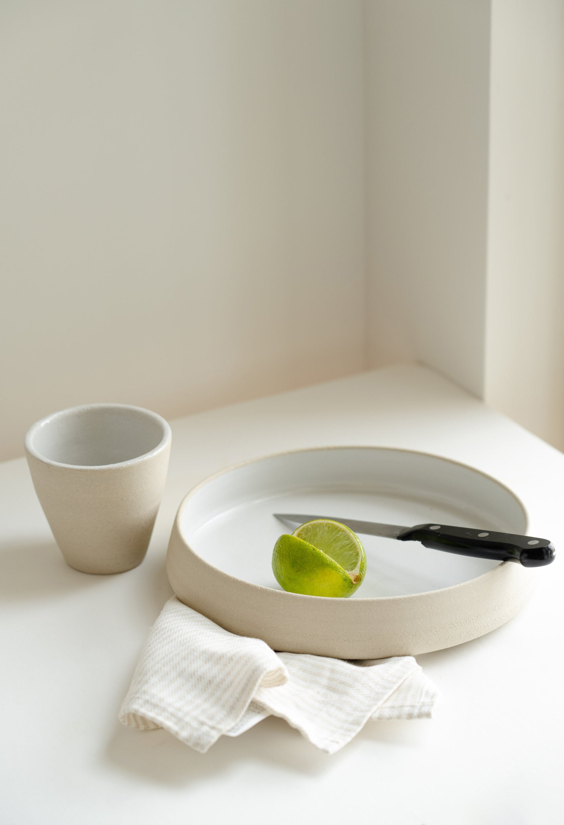 This is the most honest ceramic ware we have ever produced - exposed rough stoneware shows occasional signs of the artisans' fingers that were left during the hand-throwing process. The high-sided plate style will add a restaurant-level serving to your everyday meals. Polished, a little bit rough texture from the outside and glossy white glaze on the inside - a perfect combination of rustic style and functional meaning.